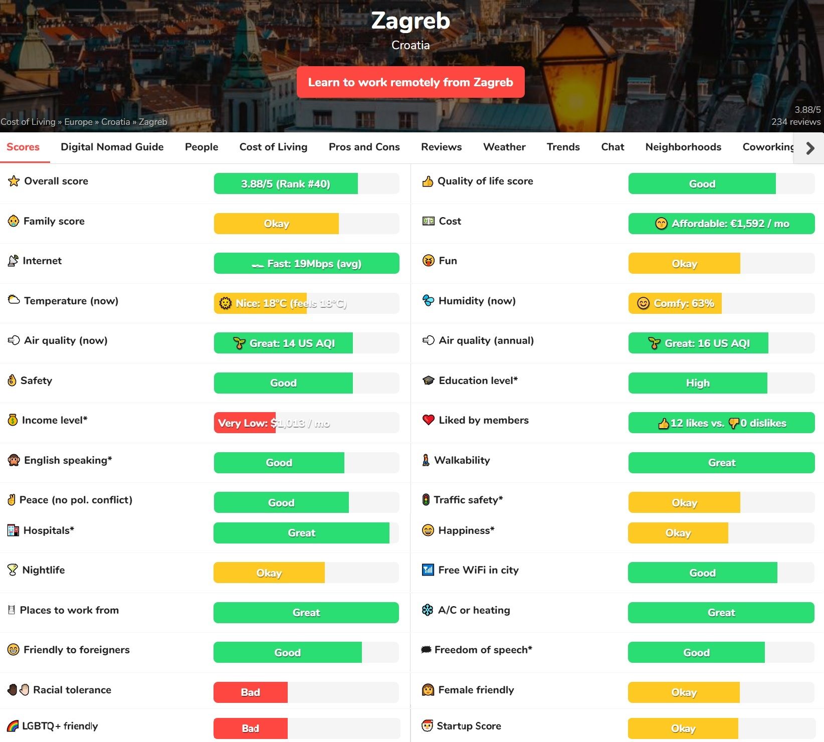 A visual may help frame the attraction – Zagreb currently ranks 44 on NomadList.com (compare that to Miami which comes in at 204!)